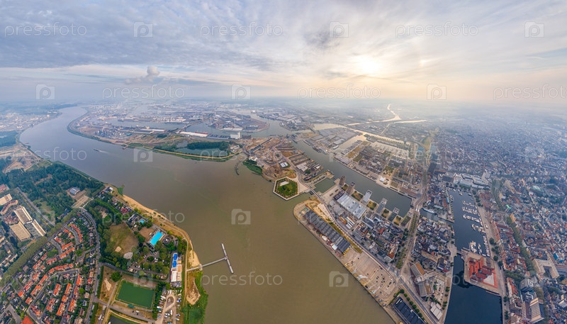 Антверпен, Бельгия. Панорама города. Река Шелда (Эскаут). Летнее утро. Вид с воздуха