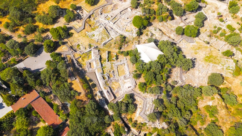 Тевфикье, Турция.Вид с воздуха на Северо-Восточный Бастион и оборонительную башню Троя VI, показывающий обрушившиеся каменные блоки и заросшую местность