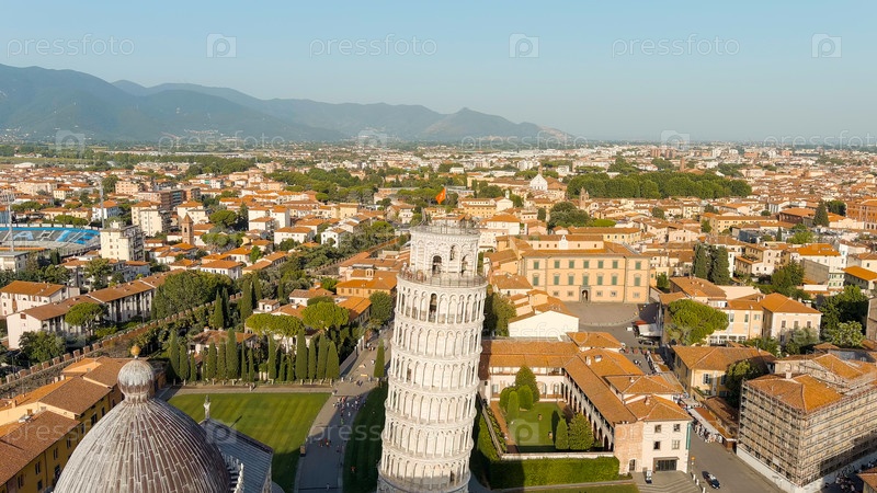 Пиза, Италия. знаменитая наклонная башня и пизанский собор в Пьяцце-дей-Мираколи. лето. вечерние часы, взгляд с воздуха