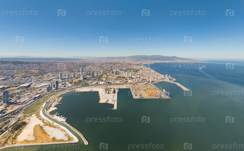 Измир, Турция.Панорамный вид с воздуха из Байракли в сторону центра города.Современная набережная, небоскребы, порт с кранами и дальний горизонт центра города.Летний день.Вид с воздуха
