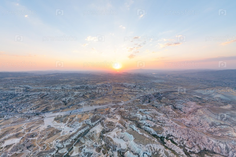 Широкий воздушный снимок Красной долины с ярким закатом солнца, светящимся на пастельно-розовом небе над эродированными плато и глубокими долинами