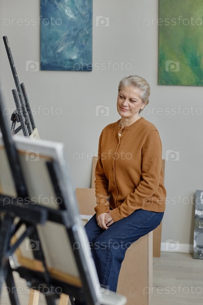 Вертикаль старшей белокожей женщины, наблюдающей за картинами во время урока искусства
