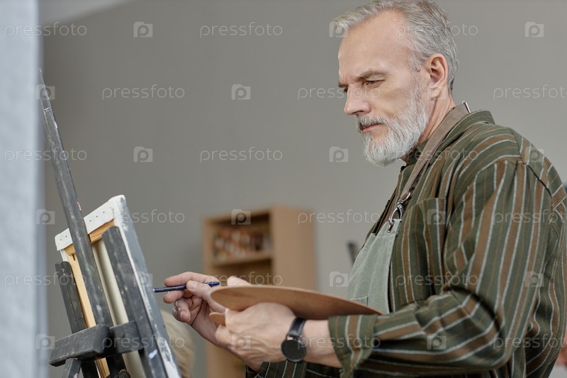 Кавказский мужчина среднего возраста рисует на холсте во время занятий искусством