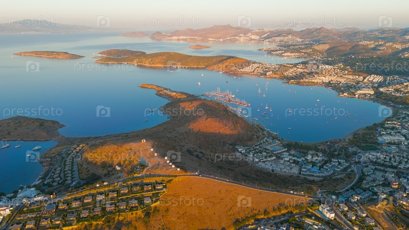 Бодрум, Турция.Утренняя воздушная панорама ветряных мельниц Бодрума руины в красном свете восхода солнца.Древние каменные круги с заливом Гокова позади