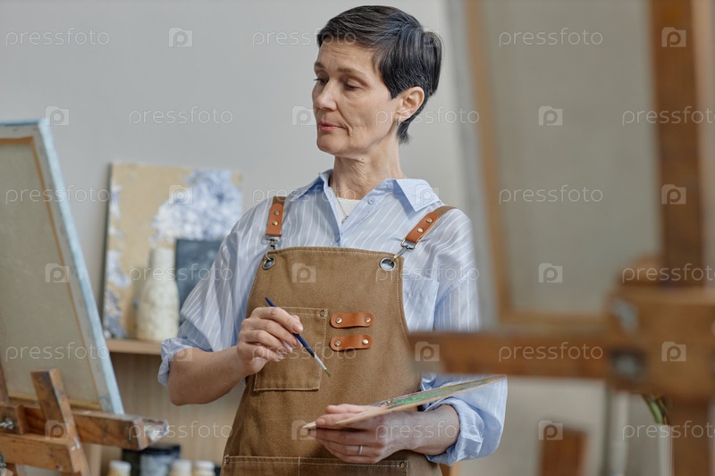 Кавказская женщина среднего возраста рисует на холсте во время занятий искусством
