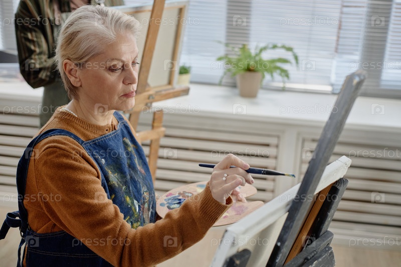 Кавказская женщина рисует на холсте во время семинара по искусству