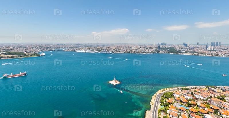 Босфор с сухим грузоносцем в заливе Золотого Рога, вид на Девичью башню, районы Фатих, Бейоглу и Ускудар