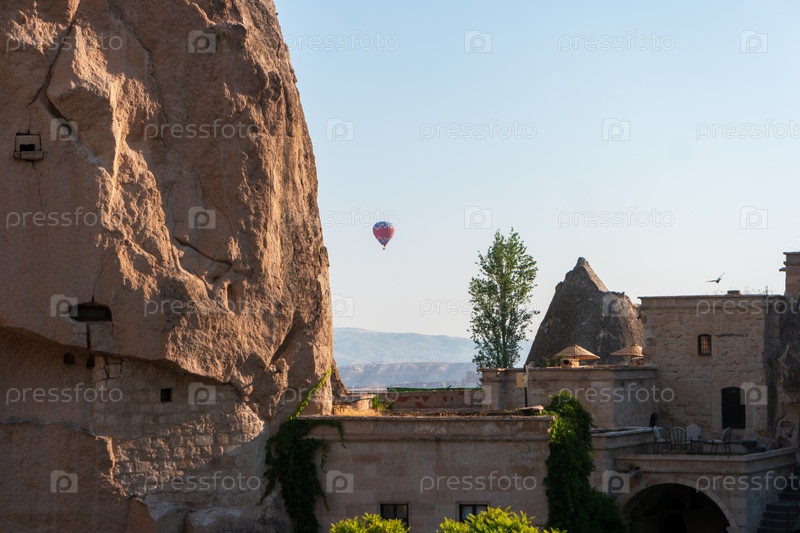 Спокойный пейзаж с характерными скальными образованиями, традиционные каменные здания с коническими крышами, воздушный шар и холмы под чистым голубым утренним небом