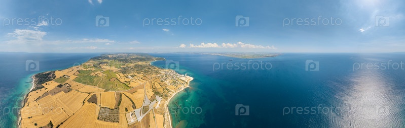Seddulbahir, Eceabat, Турция. 360-цилиндрическая панорама над Дарданелльским проливом с тяжелым морским движением, грузовыми кораблями и танкерами, плавающими мимо мыса Хелес