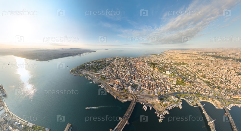 Широкая воздушная панорама Золотого Рога с мостом Галата и метрополитена Халик, Босфорского пролива, Мраморного моря из района Фатих
