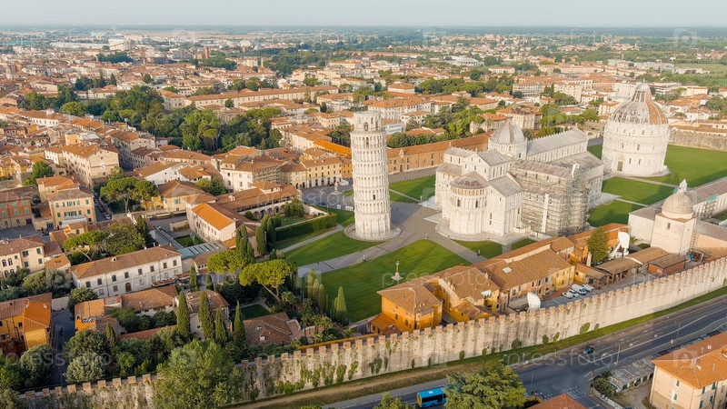 Пиза, Италия. Знаменитая наклонная башня и пизанский собор в Пьяцце деи Мираколи. Лето. Утренние часы, взгляд с воздуха