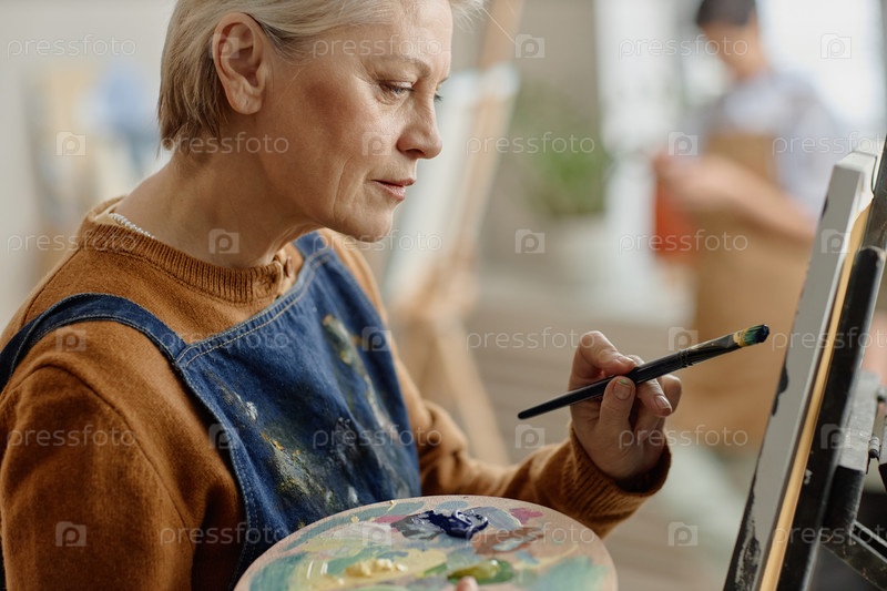 Кавказская старшая женщина рисует полотна во время занятий искусством в помещении