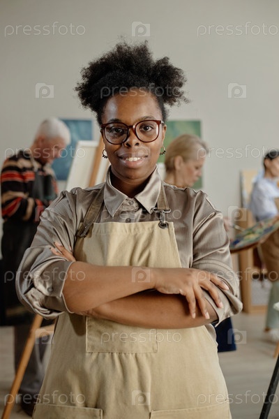 Вертикаль молодой взрослой чернокожей женщины, уверенно стоящей в классе искусства
