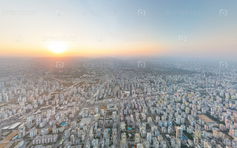 Мерсин, Турция. жилые кварталы Мезитли в золотое время суток с закатом солнца за горами. многоквартирные дома и улицы купаются в теплом свете захода солнца сверху. вид из воздуха