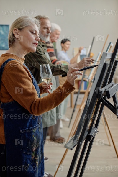 Вертикаль старшей кавказской женщины, рисующей на холсте в классе искусства