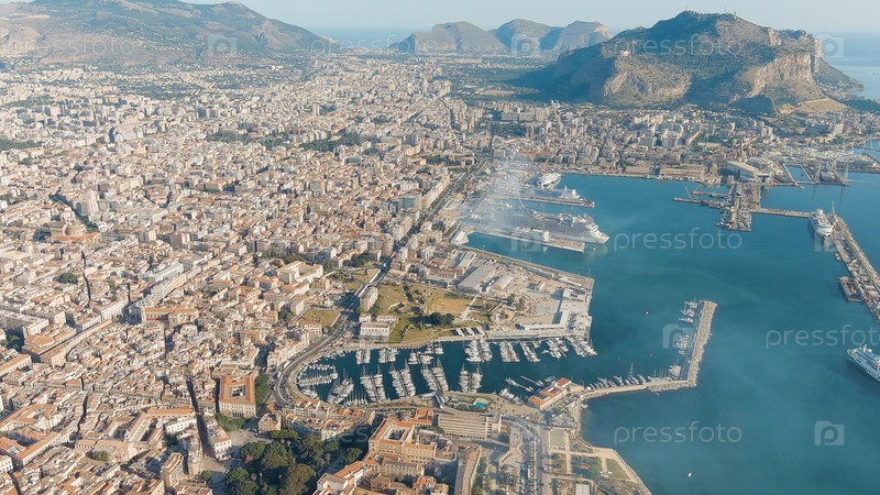 Палермо, Сицилия, Италия.В порту Палермо пришвартовано большое круизное судно.Много дыма из дымохода.Палермо - столица итальянского острова Сицилия, взгляд с воздуха