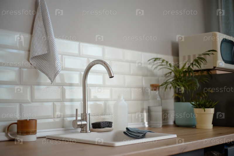 Кухонная раковина с комнатными растениями и минималистическим декором