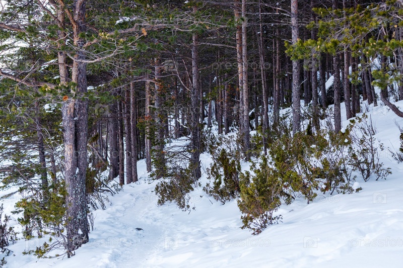 Сосновая роща на снежном холме Крестовая в Кандалакше