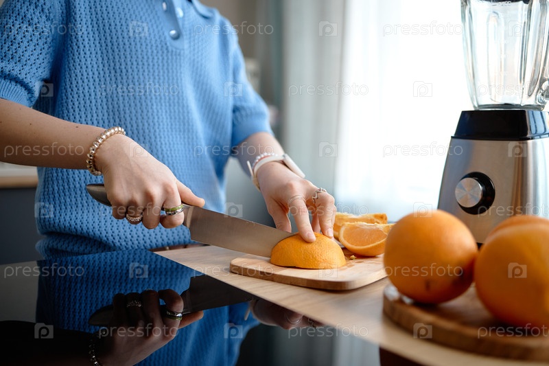 Девушка-подросток нарезает апельсин, готовя свежий сок на кухне