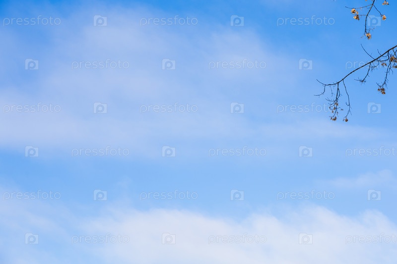Ветвь и голубое небо с рассеянными кумулярными облаками