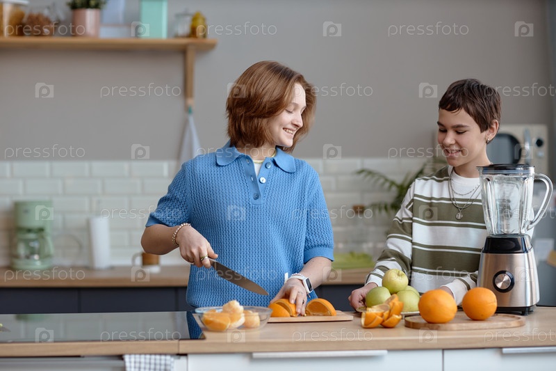 Подростки готовят свежий фруктовый смузи на кухне