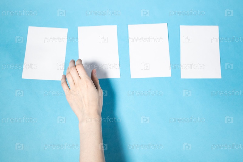 Рука выбирает из четырех листов пустой белой бумаги