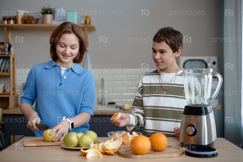 Два подростка готовят свежий фруктовый смузи вместе на кухне
