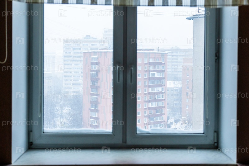 Вид через окно дома на многоквартирном доме
