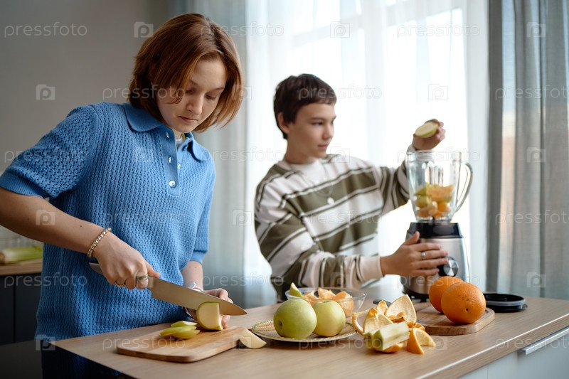 Подростковая девочка нарезает яблоки, в то время как подросток готовит фруктовый смузи