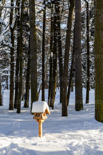 Деревянный птичий кормильник на расчистке в снежном лесу
