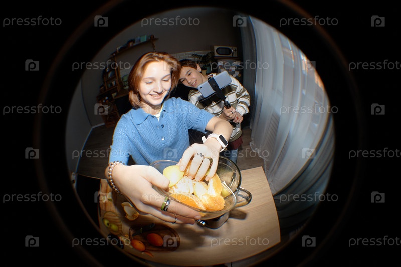 Подростковая девочка готовит еду, в то время как подростка записывает видео