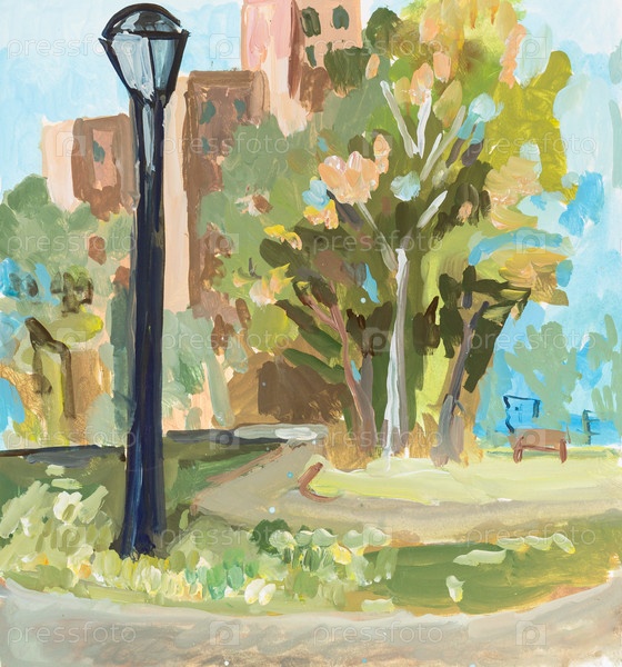 Ручно нарисованный наружный фонарь в городском парке на бумаге