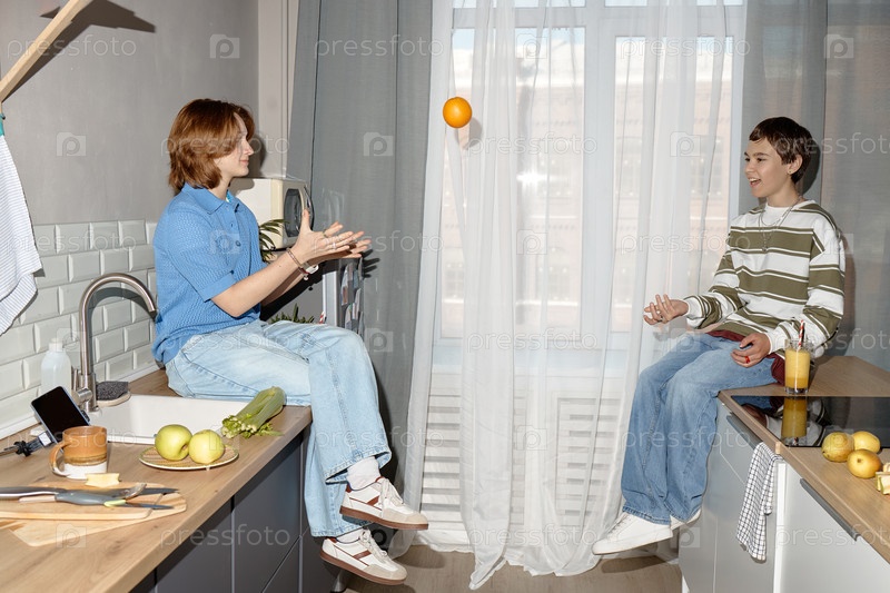 Подростки сидят на кухне, бросают апельсины и улыбаются вместе