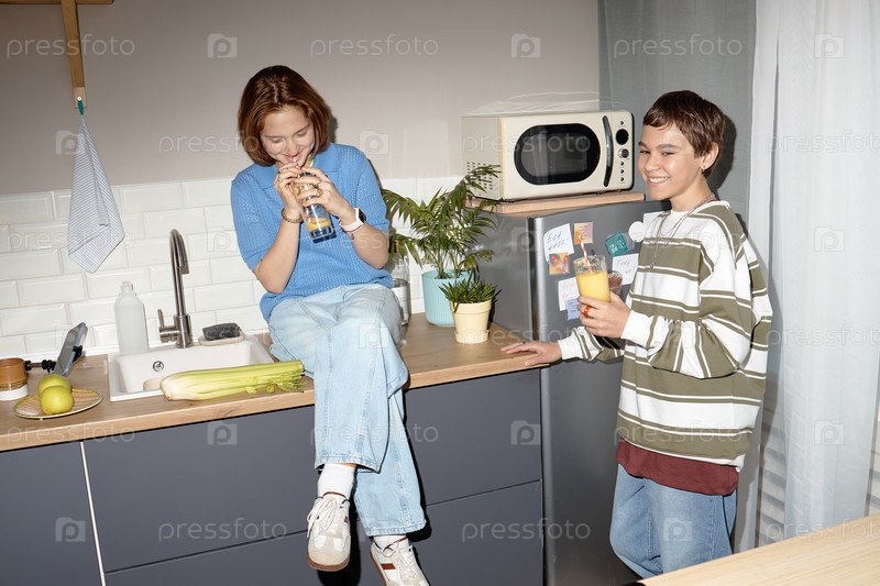 Подростковая девочка и подросток пьют сок на кухне