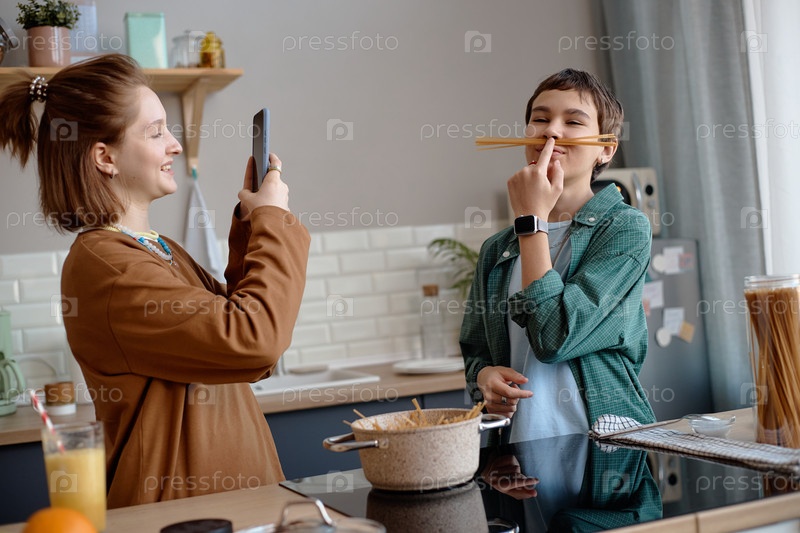 Подростки веселятся, готовят макароны и фотографируются со смартфонами