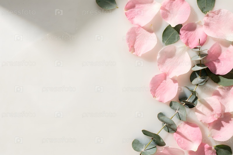 Розовые лепестки розы и эвкалипт на белой поверхности боковой композиции