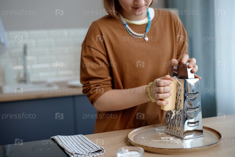 Девушка-подросток обжаря сыр на столешнице кухни, готовя еду