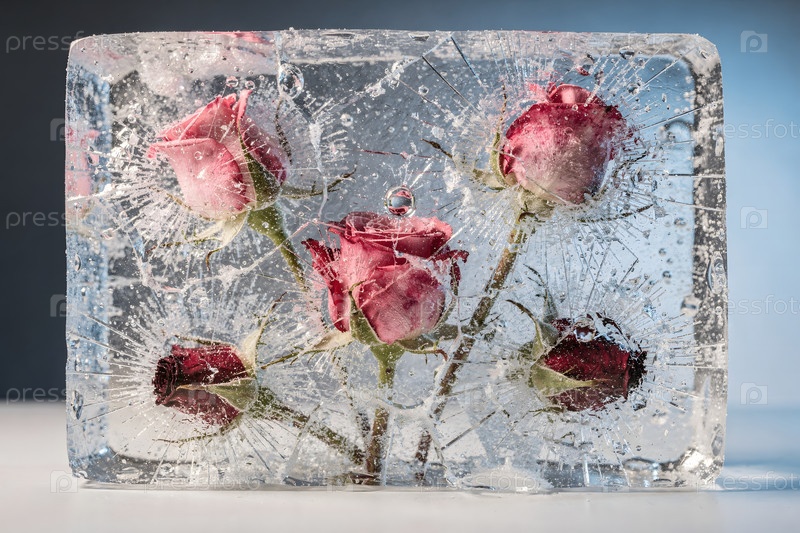 Пять розовых роз замороженных в большом треснувшемся блоке льда горизонтально