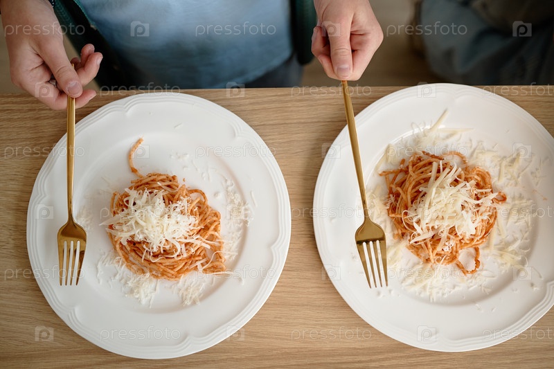 Руки молодых подростков, держащих вилки, готовясь съесть спагетти