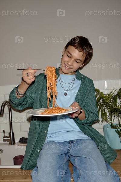 Подросток улыбается, когда ест спагетти с палочками в помещении