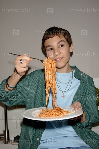 Подросток ест спагетти и улыбается в кухонной обстановке