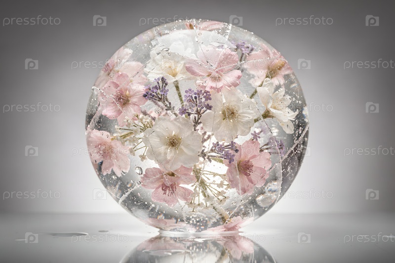 Смешанный букет весенних цветов в трещинах ледяной сферы горизонтально