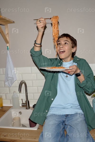 Мальчик-подросток ест спагетти с палочками на кухне