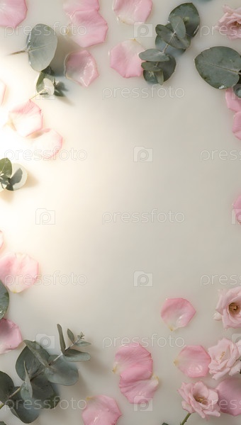 Розовые лепестки розы и эвкалипт плавают в раме для молочной ванны