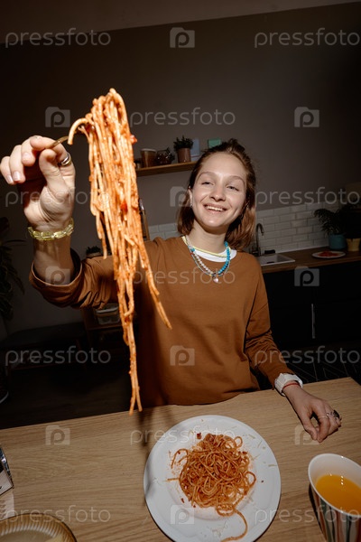 Портрет девочки-подростка, держащей спагетти и улыбающейся в помещении