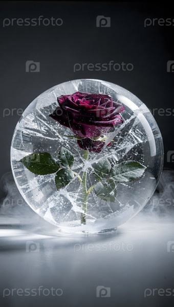 Темно-фиолетовая роза в трещинах ледяной сферы с дымом вертикально