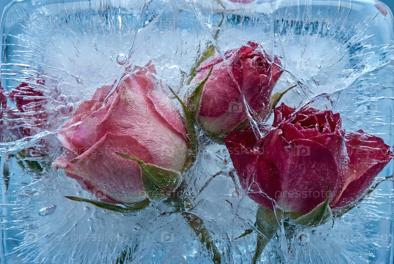 Розовые и красные розы заморожены в блоке льда Близкий макро горизонтальный