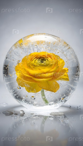 Желтый ранункул в ледяной сфере с каплями воды Вертикальный портрет