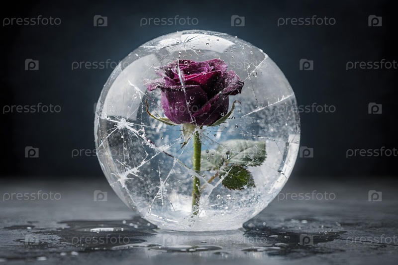 Фиолетовая роза в трещинах ледяной сферы на темном фоне горизонтально