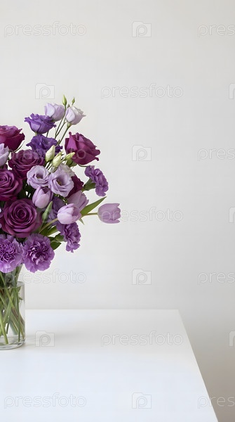 Букет фиолетовых и лиловых цветов в стеклянной вазе на белом столе